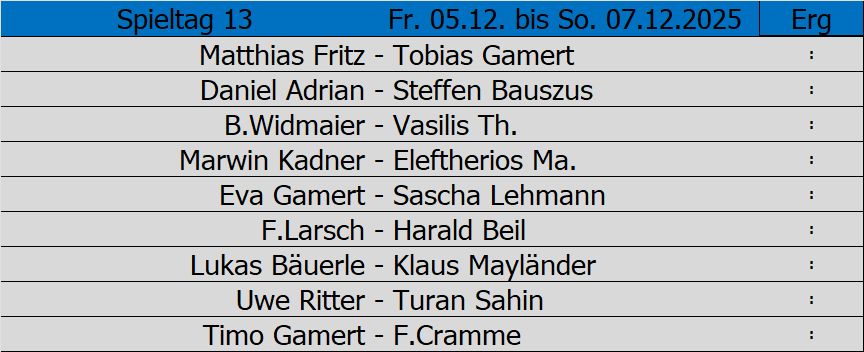 1. Liga: Tabellenführer Jens Greiner verliert gegen Sefa Alici mit 7:10, thront aber weiter mit 2 Punkten Vorsprung auf dem Platz an der Sonne. Verfolger Tobias Kaufhold verliert gegen Aris Tzimas, der dadurch nach Punkten aufschließen kann. Zu erwähnen wäre noch, dass alle drei Kellerkinder ihre Spiele gewinnen konnten.