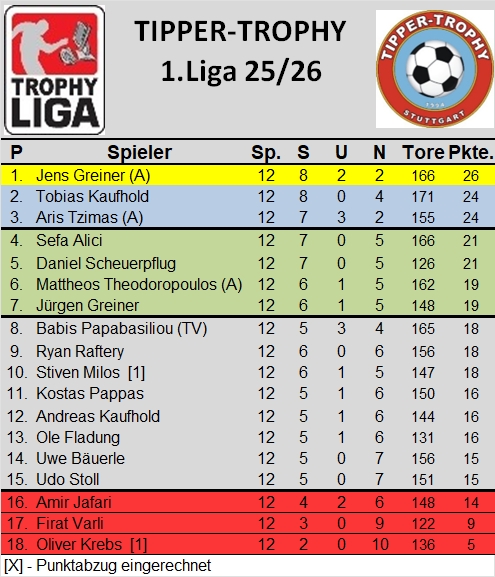2. Liga: Hier gab es einen Skandal: Tabellenführer Timo Gamert konnte das vergangene Skandal-Wochenende aus dem Trikot schütteln und hat im Duell der jungen Wilden mit 10:8 gegen Vasilis Theodoropoulos gewonnen. Im Verfolgerduell kann Urgestein Bernd Widmayer klar mit 10:6 gegen Harald Beil gewinnen und ist damit Zweiter. Bernd scheint einen Lauf zu haben. Dritter bleibt Eleftherios Mavroudakis, der zwar mit 8:6 gegen Franky Larsch gewinnt, aber wegen seinem Tippvergesser am Freitag einen Punktabzug hinnehmen muss.