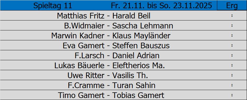 2. Liga: Tabellenführer Timo Gamert verliert klar mit 8:16 gegen Harald Beil. Er bleib allerdings aufgrund der mehr erzielten Tore punktgleich mit Harald Beil vorne. Die Verfolger Eleftherios Mavroudakis (10:16 gegen Bernd Widmaier) und Vasilis Theodoropoulos (14:16 gegen Felix Cramme) haben Ihre Chance auf die Tabellenführung vermasselt.