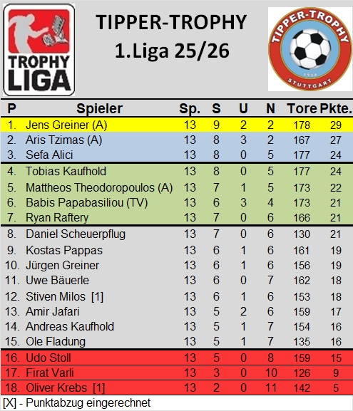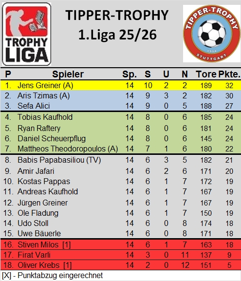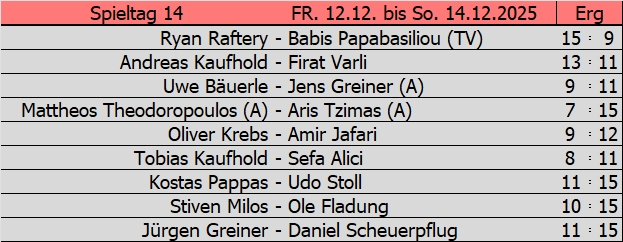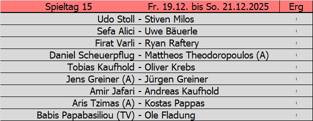 1. Liga: Tabellenführer Jens Greiner zeigt fährt im Spitzenspiel um Platz 1 die Krallen aus und fertigt seinen (ehemaligen) direkten Verfolger Tobias Kaufhold mit 12:6 ab. Neuer Zweiter ist Aris Tzimas, der dem zweiten Kaufhold, nämlich Andreas eine 12:10 Niederlage beibringt. Im Keller beendet Kostas Pappas den kleinen Höhenflug von Firat Varli jäh mit 11:4.